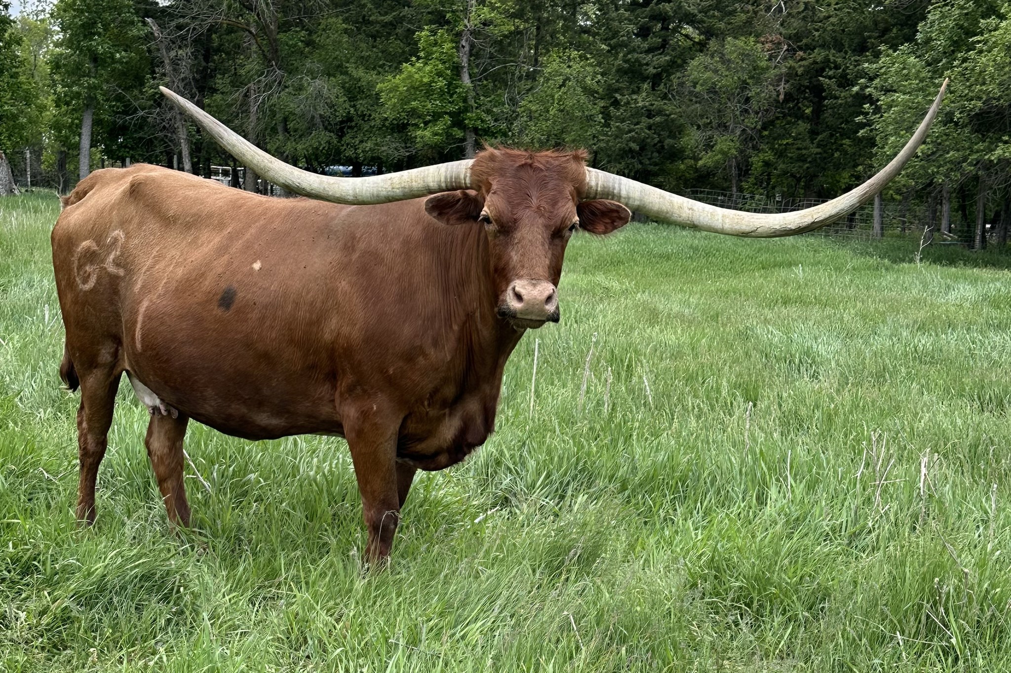 Legacy has a lot of horn and she stays in great shape all year. She has a really nice udder even at 13 years old. She just had a huge heifer calf by Brazos Rocky 667 that looks identical to her.