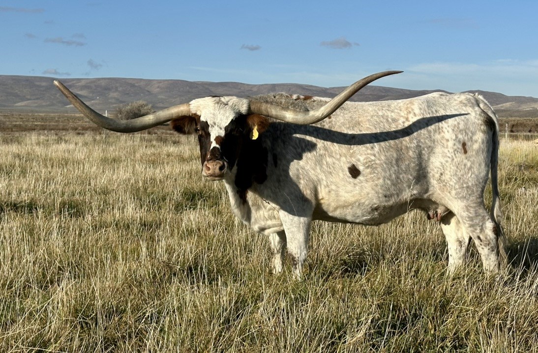 Tall and thick brindle and white cow with a super set of rolling horns. Great mother and bred to 100" BR Jungle Jim for 2026. Cow only for sale.